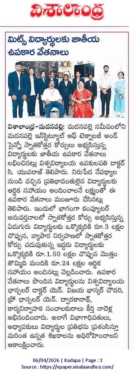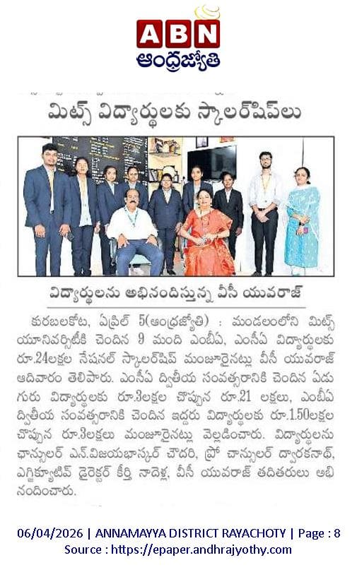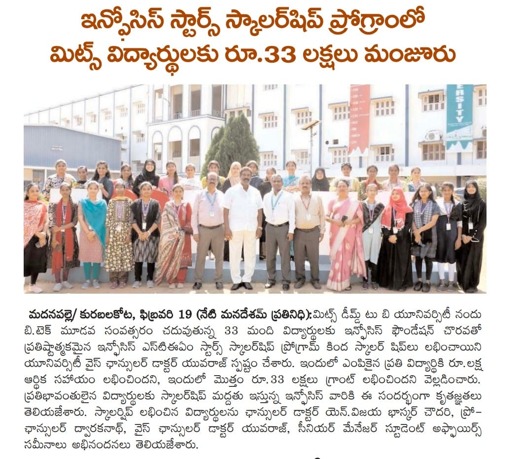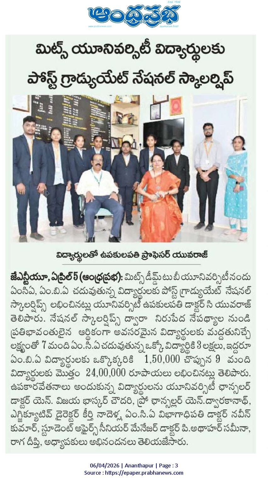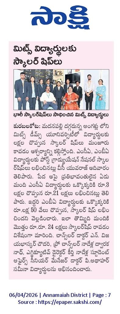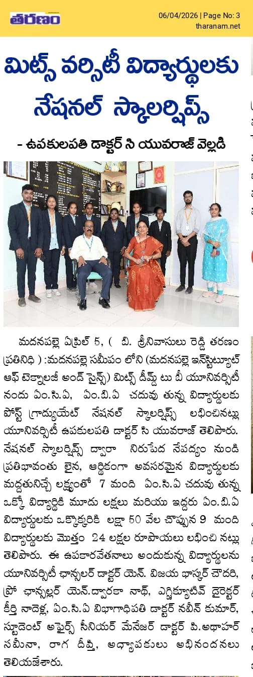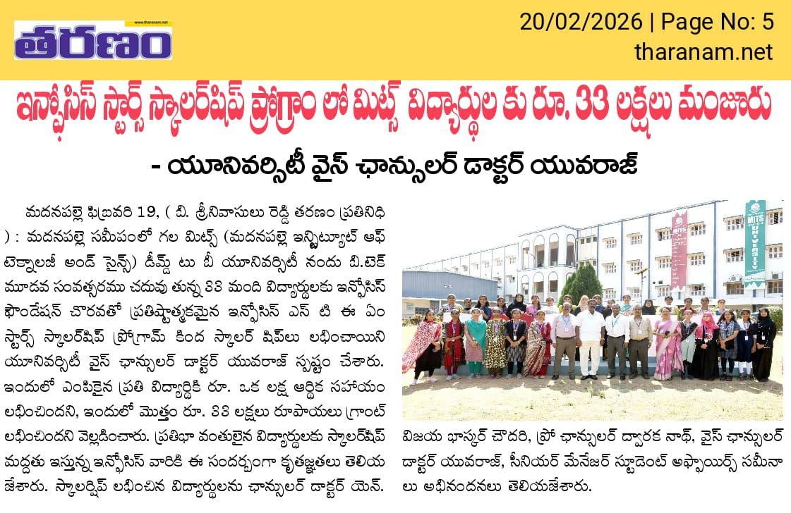 Madanapalle Institute of Technology & Science (MITS), Deemed to be University, firmly believes that education is the greatest enabler of social and economic progress. In pursuit of its mission to promote inclusive excellence, MITS has established a comprehensive scholarship policy designed to support and encourage students from diverse backgrounds, ensuring that financial constraints do not impede access to quality education.