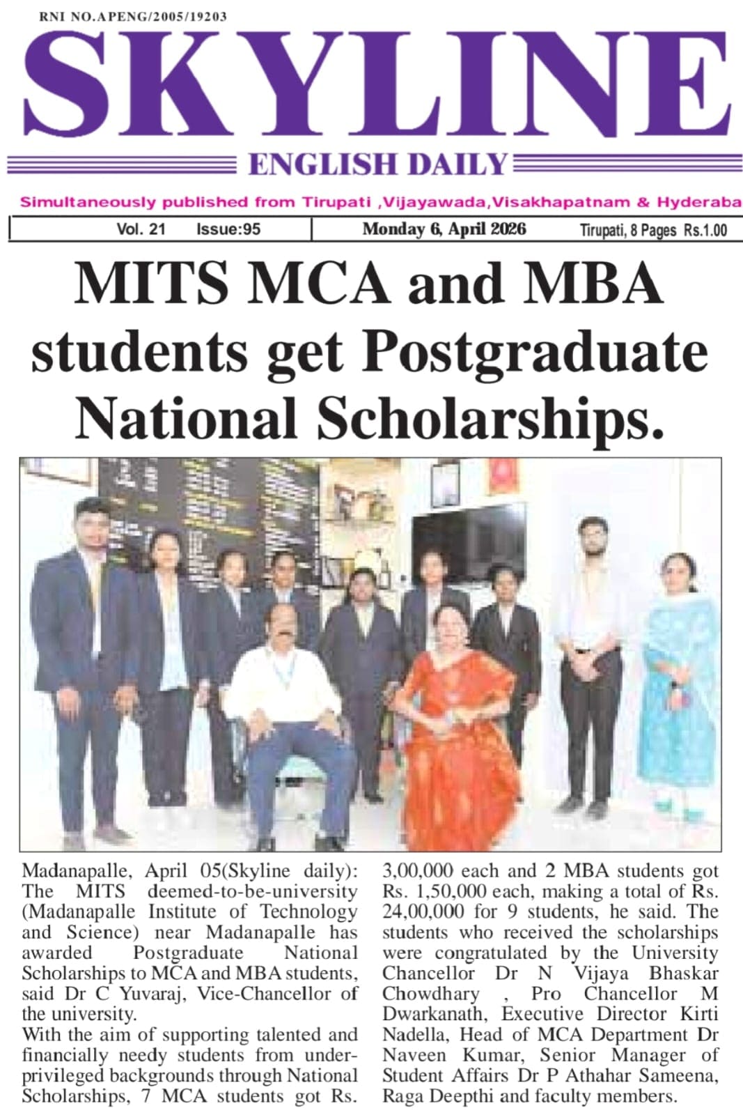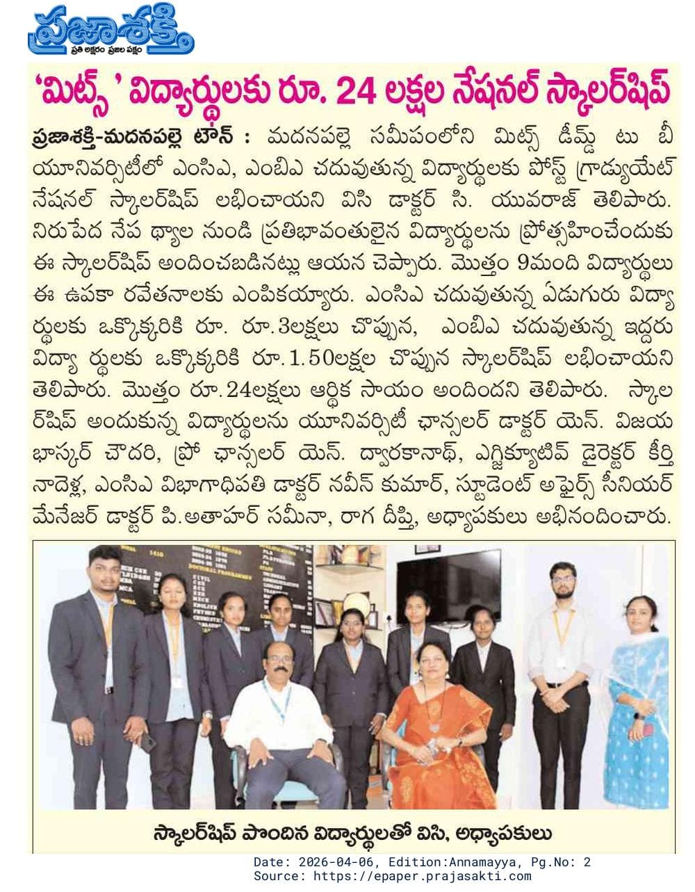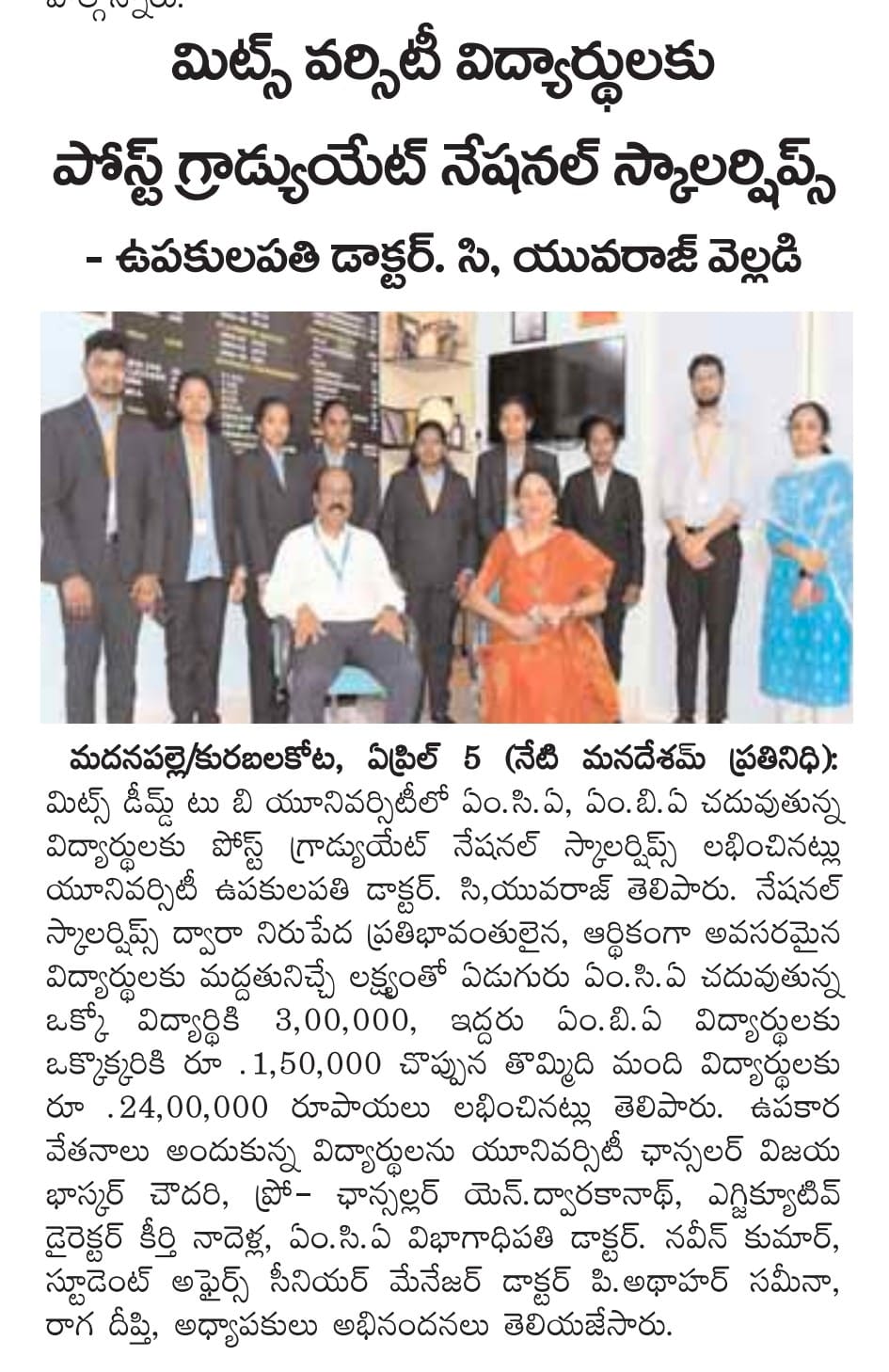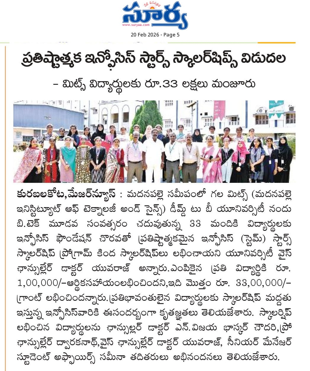 Madanapalle Institute of Technology & Science (MITS), Deemed to be University, firmly believes that education is the greatest enabler of social and economic progress. In pursuit of its mission to promote inclusive excellence, MITS has established a comprehensive scholarship policy designed to support and encourage students from diverse backgrounds, ensuring that financial constraints do not impede access to quality education.